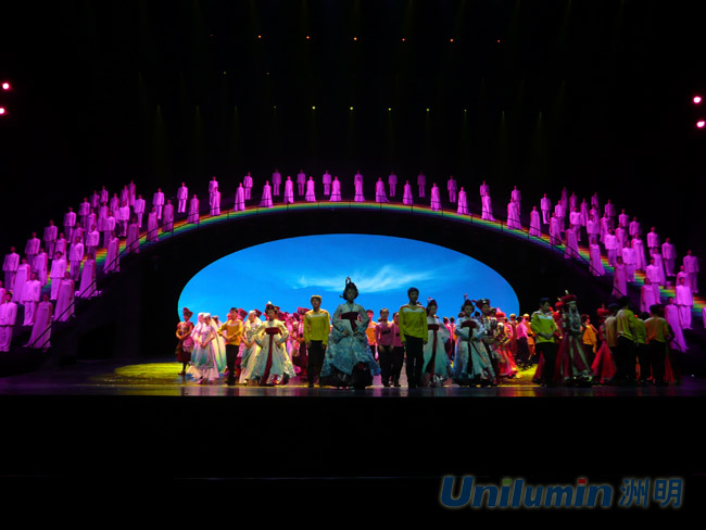 2010年初, 洲明科技承建國家大劇院大型音樂舞蹈史詩《復興之路》舞臺的巨型背景"LED室內(nèi)表貼三合一異形階梯屏"。《復興之路》對舞臺背景及燈光要求極為苛刻,堪稱迄今為止對國家大劇院舞臺調(diào)度最為豐富和復雜的劇目。為了更好的營造良好的現(xiàn)場氣氛,呈現(xiàn)震撼的視覺盛宴,將《復興之路》完美的呈現(xiàn)給現(xiàn)場觀眾;洲明人抽調(diào)精兵強將,根據(jù)舞臺現(xiàn)場的條件,決定采用自主研發(fā)的具有世界首創(chuàng)性1000HZ的高刷新率及亮度色度可逐點校正的異型LED臺階顯示屏。采用先進的模塊式封裝工藝,在63級臺階上為臺階立面安裝LED顯示屏;洲明人不怕辛苦在現(xiàn)場進行了近百次的無故障調(diào)試運行,最終營造出精彩的視聽氛圍使《復興之路》給現(xiàn)場領導和觀眾深受震撼。