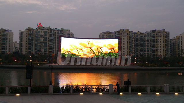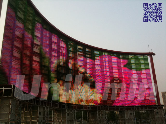 據項目負責人介紹,這個項目最大的亮點在于LED顯示屏的智能導軌操控,采用全導軌智能設計,屏幕自由收展,白天屏幕如不使用收起折疊在兩邊,就展示出“中國中山”四個大字,為中山代言,而傍晚將LED顯示屏伸展出來,作為顯示屏使用,播放炫彩畫面,多功能性。此塊LED顯示屏市中山市岐江廣場最大的一塊格柵屏LED顯示屏,正好面對著岐江,而提起岐江不難讓人想起當地有名的夜游岐江,順江而下,一覽江邊風景,這塊多彩的顯示屏也為當地夜景增添了一到絢麗的色彩。據了解,此次項目總面積高達820㎡,是國內格柵屏應用面積的一次突破,整個項目為弧形屏,采用鋁合金框架,重量輕,每平方米≤28kg,可左右開啟全吊裝式安裝,箱體采用網格鏤空式設計,充分減輕來自外界的抗擊,在強風、強壓等惡劣天氣下保持正常工作,眾所周知,格柵屏的通透性在使用中很重要,太低影響美觀,太高影響播放效果,岐江廣場的通透格柵外形設計為50mm,通透率達30%,可透光、透風、防水,是格柵屏最佳的使用模式。