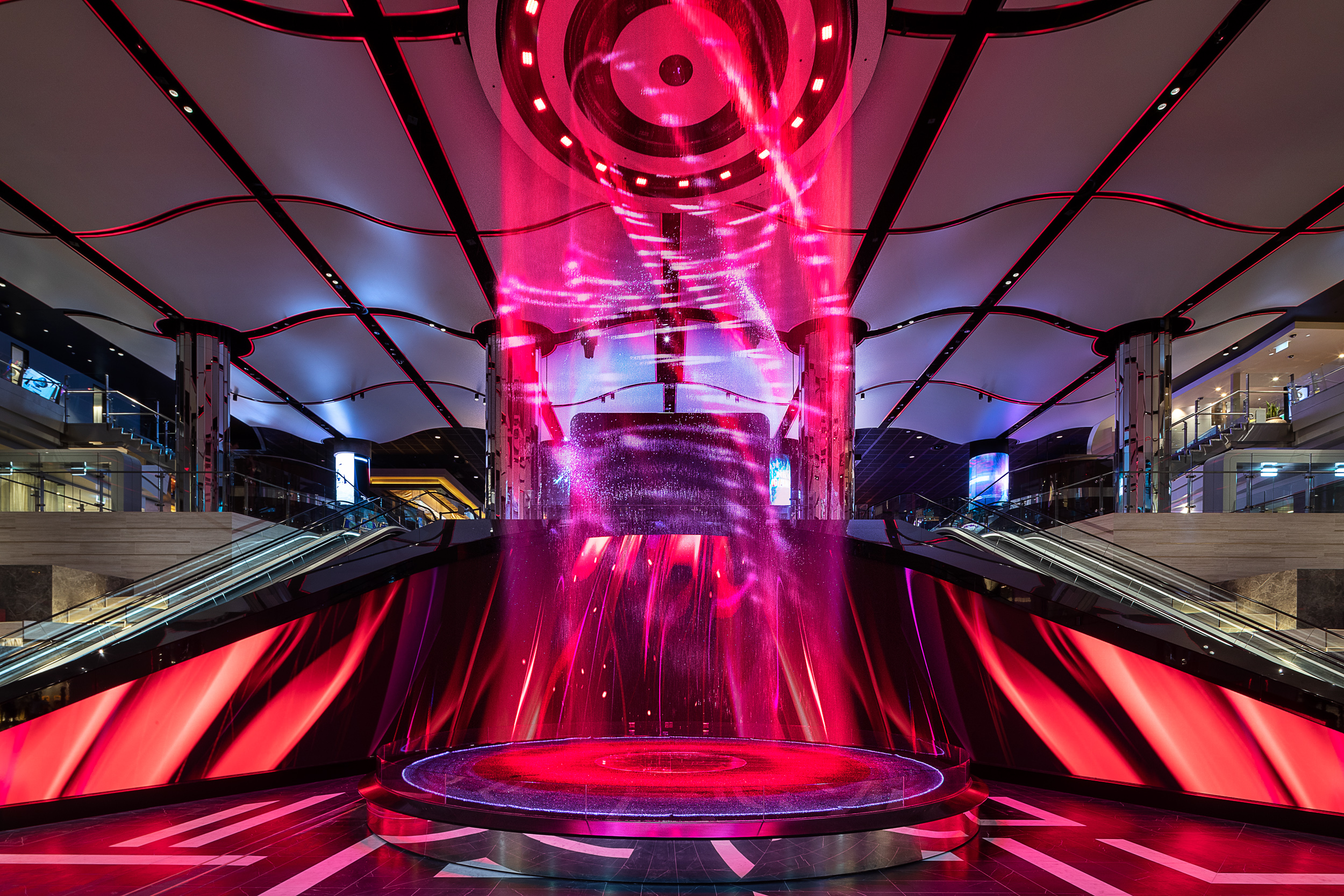 大屏旁的圓柱形裝置使用了洲明雷迪奧系列LED燈條,其靈活特性能夠實現整齊的弧形安裝,通過編程能夠完美呈現不同造型的瀑布,充分展現了空間的靈感躍動。