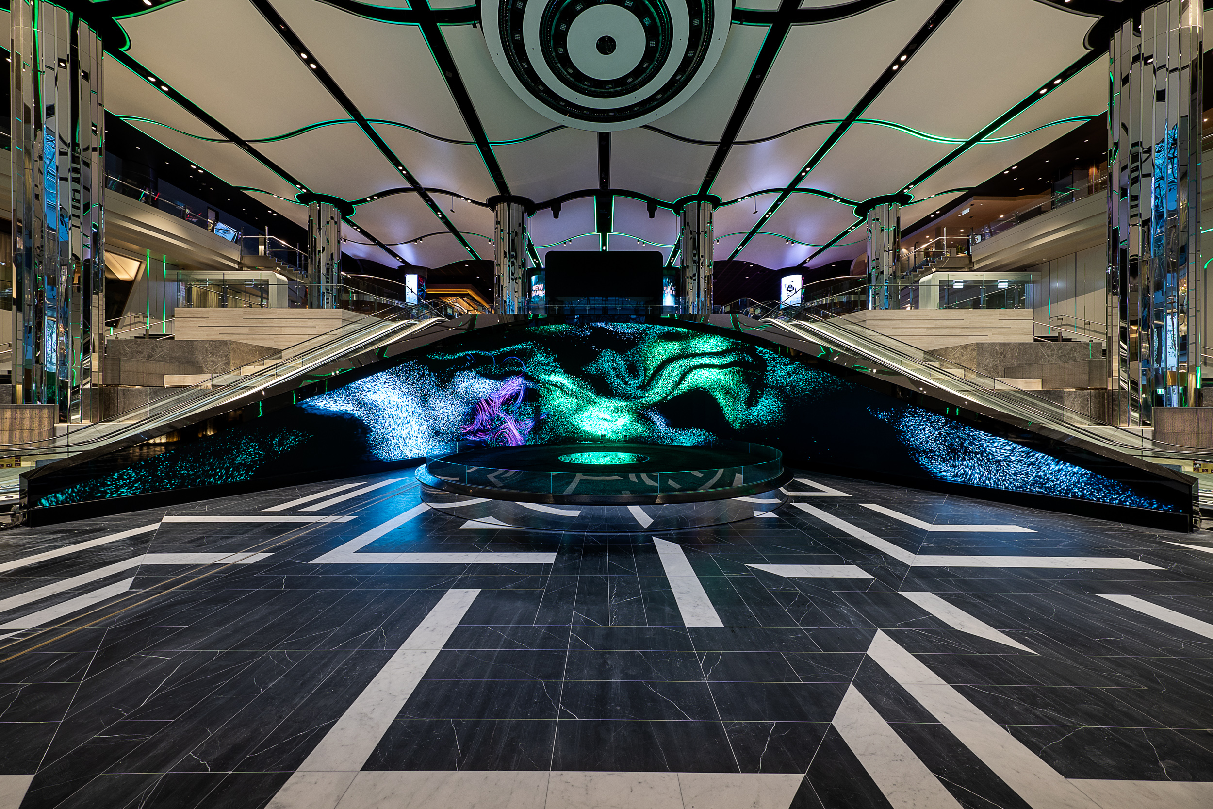 面積最大的新月形互動顯示屏擁有8k超高清分辨率,由洲明雷迪奧系列Black OnyX LED顯示屏搭建而成。底部最長處由56塊LED顯示屏組成,長達25米。屏幕中的流動型斜坡由半塊、1/4塊及定制三角屏搭建,配合定制的水平斜坡和屏體內向曲線的安裝框架,將“畫布”無限延伸開來。
