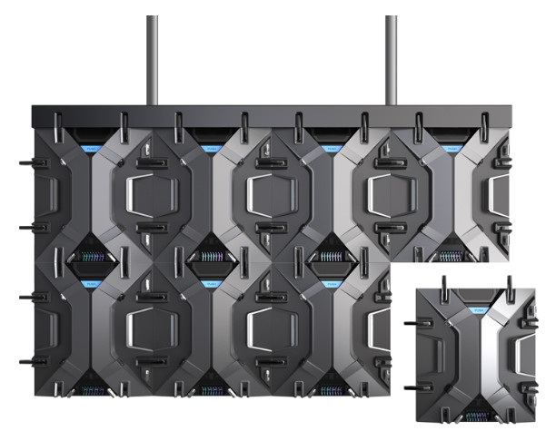 “高端小間距單元Unano,打破最小租賃LED大屏密度記錄,超高精度安裝鎖扣,實現完美平整度,且自帶拼弧設計。‘X’形設計項目貫穿產品,形成無限連續幾何科技形態。” ——主辦方介紹Unano