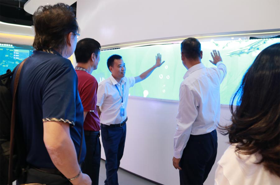 來訪嘉賓一行重點參觀了洲明科技總部展廳,實地考察了洲明行業指控中心解決方案、大數據可視化平臺、智慧城市“端+云”解決方案等一系列創新技術成果及應用情況。洲明工作人員向來訪嘉賓介紹了洲明行業指控中心解決方案技術優勢與落地應用情況,并用iPad為嘉賓現場演示了UCM、UMI、Ucare等洲明顯控運維平臺軟件系統對大屏的完美操控。