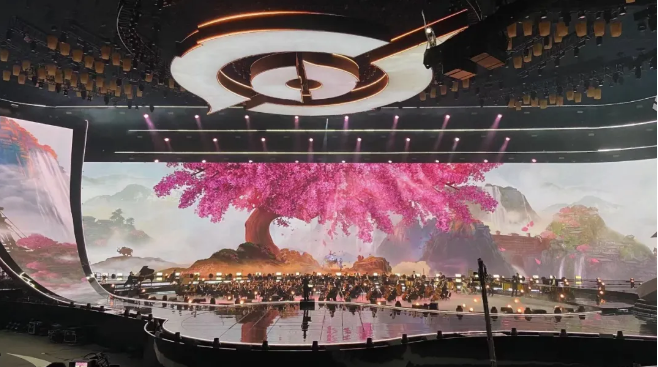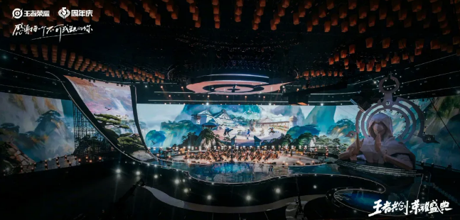 慶典中,洲明視顯解決方案以主背景LED巨屏、瀑布屏和地磚屏等各類創(chuàng)意屏體的聯(lián)動,將整個舞臺妝點得美輪美奐,搭配燈光、音響等技術(shù),不僅為表演者營造出更為夢幻的表演氛圍,也更深刻地將王者榮耀IP融入表演,為觀眾提供身臨其境的沉浸式觀看體驗。