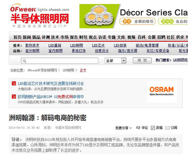 從當前看,自拓展互聯網電商銷售渠道以來,這些工作環環相扣,緊密配合,共同驅動LED家居照明電商品牌洲明翰源的推廣與影響力,提升了公司在業內的知名度及市值,彌補了洲明在家居照明市場的短板,拓寬了產品線,13年雙11的單日2200W的驕人業績也證明了洲明的電子商務之路初步取得了預期的成效。